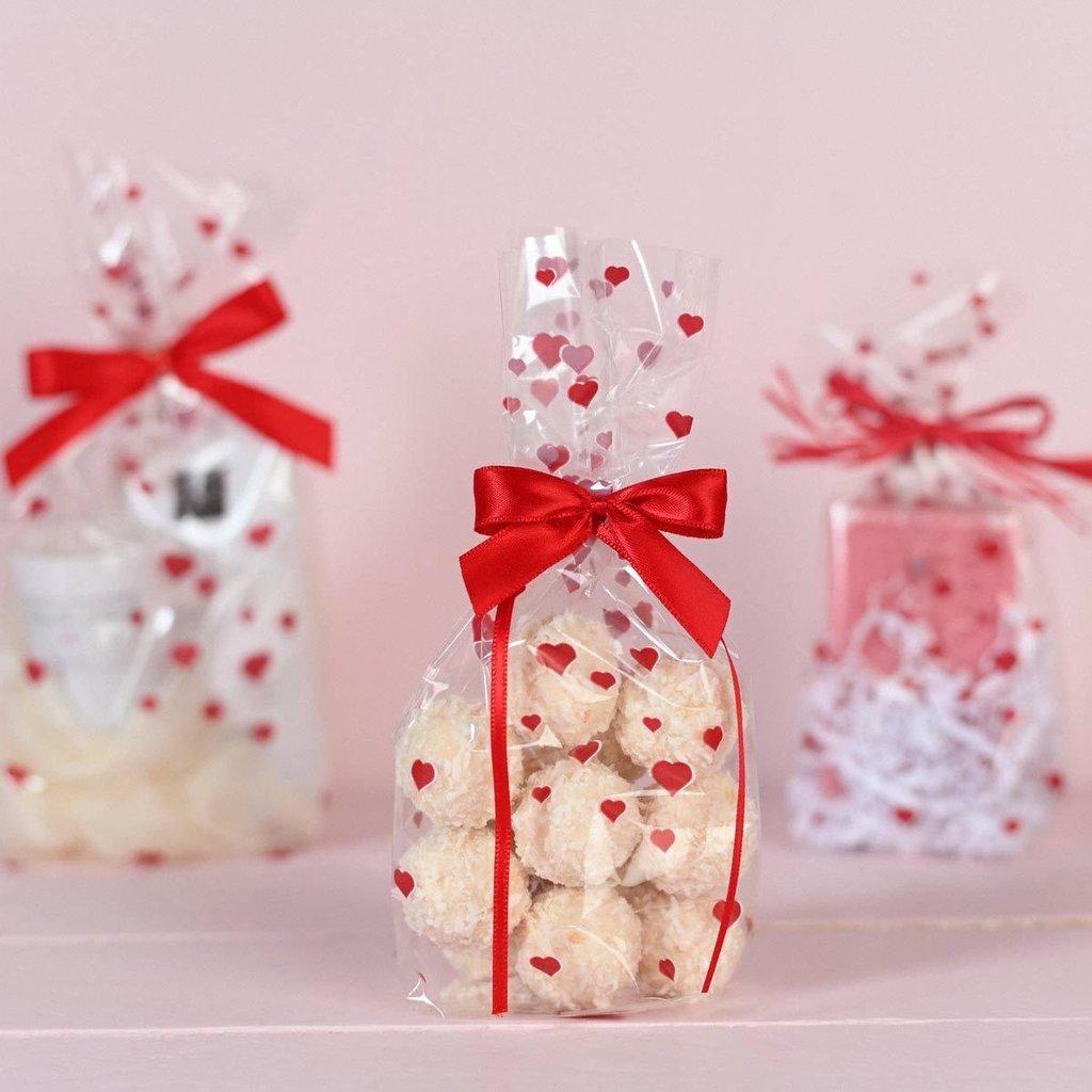Der transparente Kreuzbodenbeutel mit rotem Herzmotiv bietet eine stilvolle Möglichkeit, kleine Leckereien attraktiv zu verpacken. Pralinen, Kekse, Gebäck oder kleine Give-aways kommen darin besonders schön zur Geltung – ideal für Valentinstag, Hochzeiten, Muttertag und viele weitere Anlässe. Dank seines dekorativen Designs eignet er sich hervorragend als hochwertige Geschenkverpackung für Gastronomie, Hotellerie, Konditoreien und Feinkostgeschäfte.
