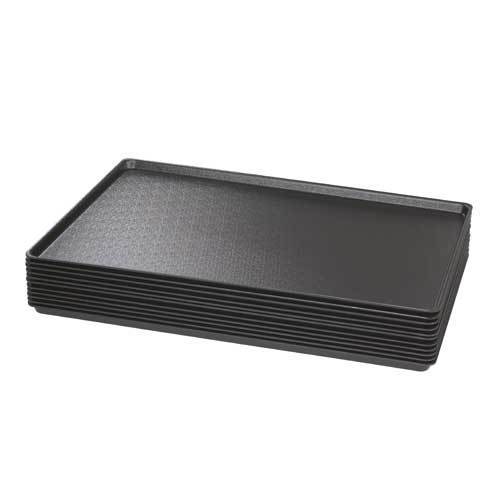 Schwarze Auslegetabletts aus widerstandsfähigem, spülmaschinengeeignetem Premium-Kunststoff.