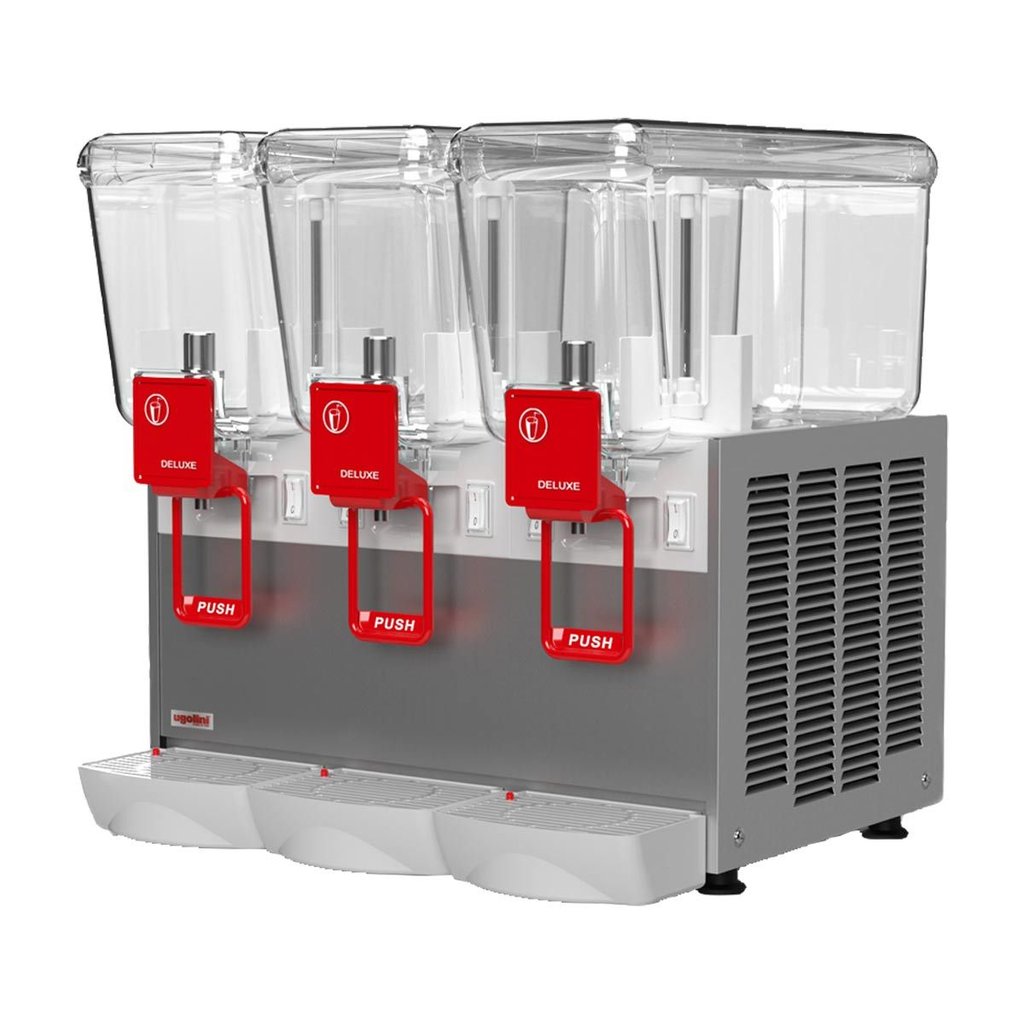 Dieser Getränkespender eignet sich ideal für den professionellen Einsatz im Selbstbedienungsbereich. Ein integriertes Sprudelrohr fördert das Getränk nach oben zum Deckel, von wo es entlang der Innenwände zurückfließt – ein Effekt, der für eine attraktive Präsentation sorgt. Die drei separaten Behälter ermöglichen die gleichzeitige Kühlung und Ausgabe unterschiedlicher Getränke.