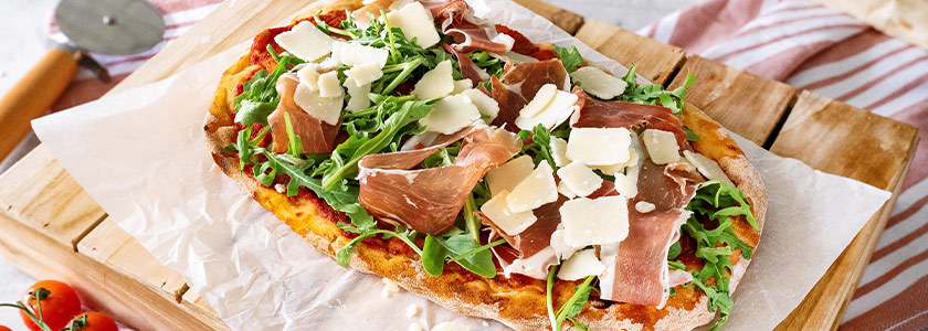 Pinsas mit Tomatensauce bestreichen und mit Rucola sowie Parmaschinken belegen. Parmesan darübergeben und servieren.