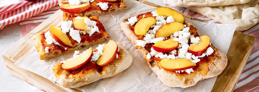 Pinsas mit Tomatensauce bestreichen, den Ziegenkäse darauf verteilen und mit den Nektarinenscheiben belegen.